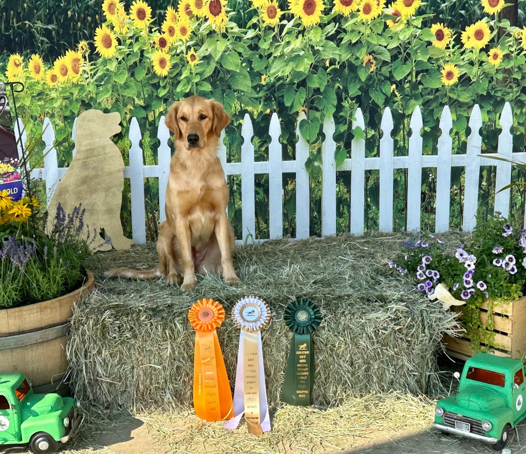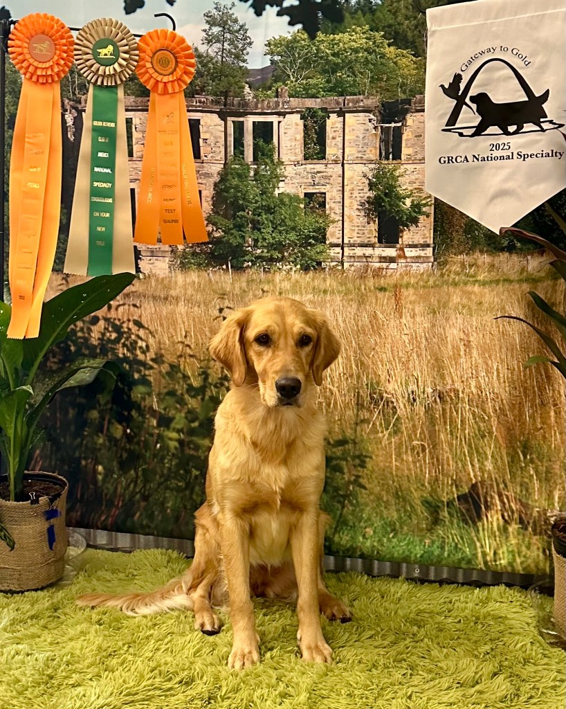 Rory at GRCA National Specialty in 2023, Albany, Oregon. Triathlon Award winner. Junior Hunter pass, WC title, Novice Rally pass, CCA title.